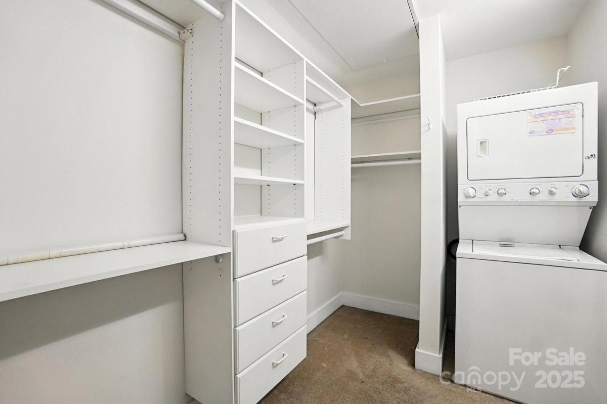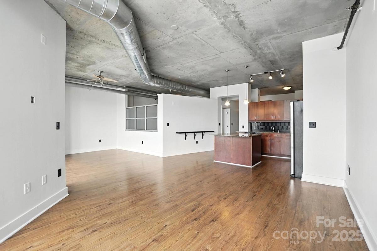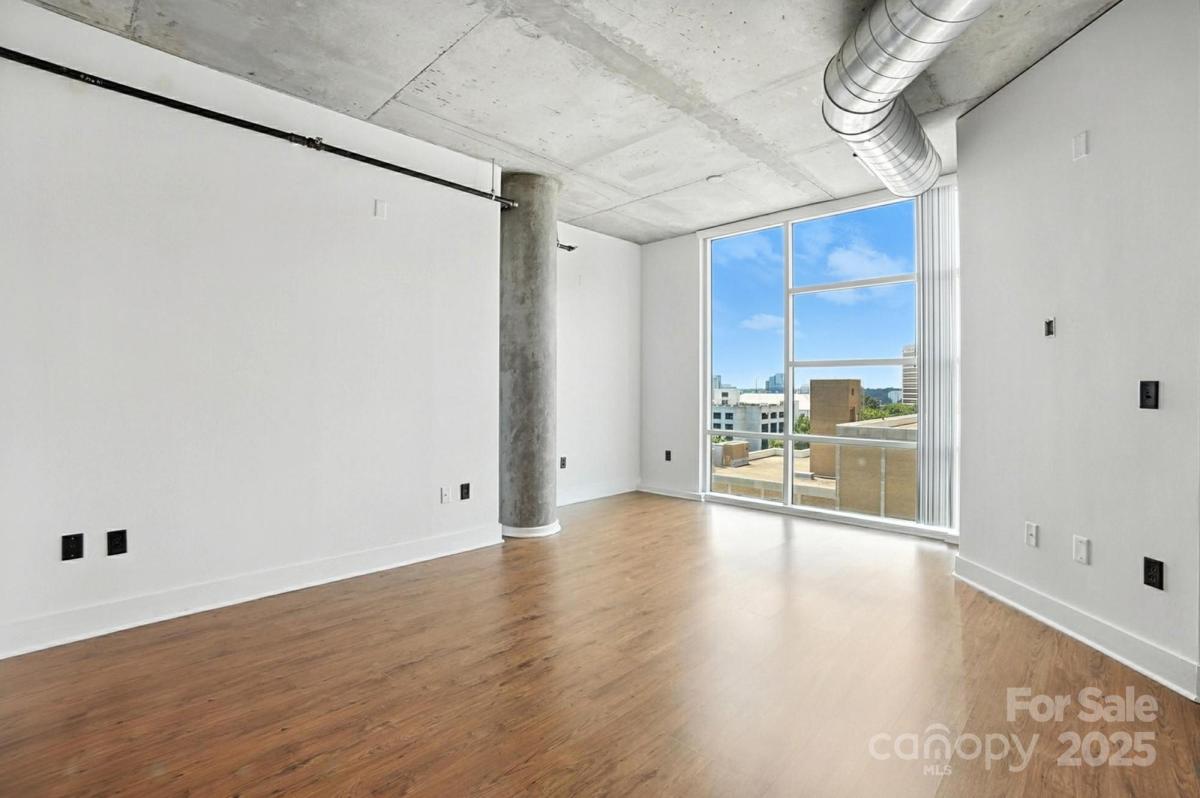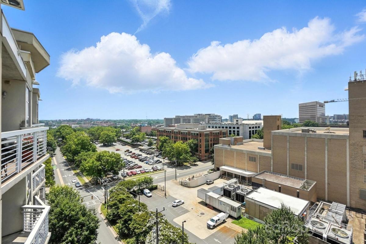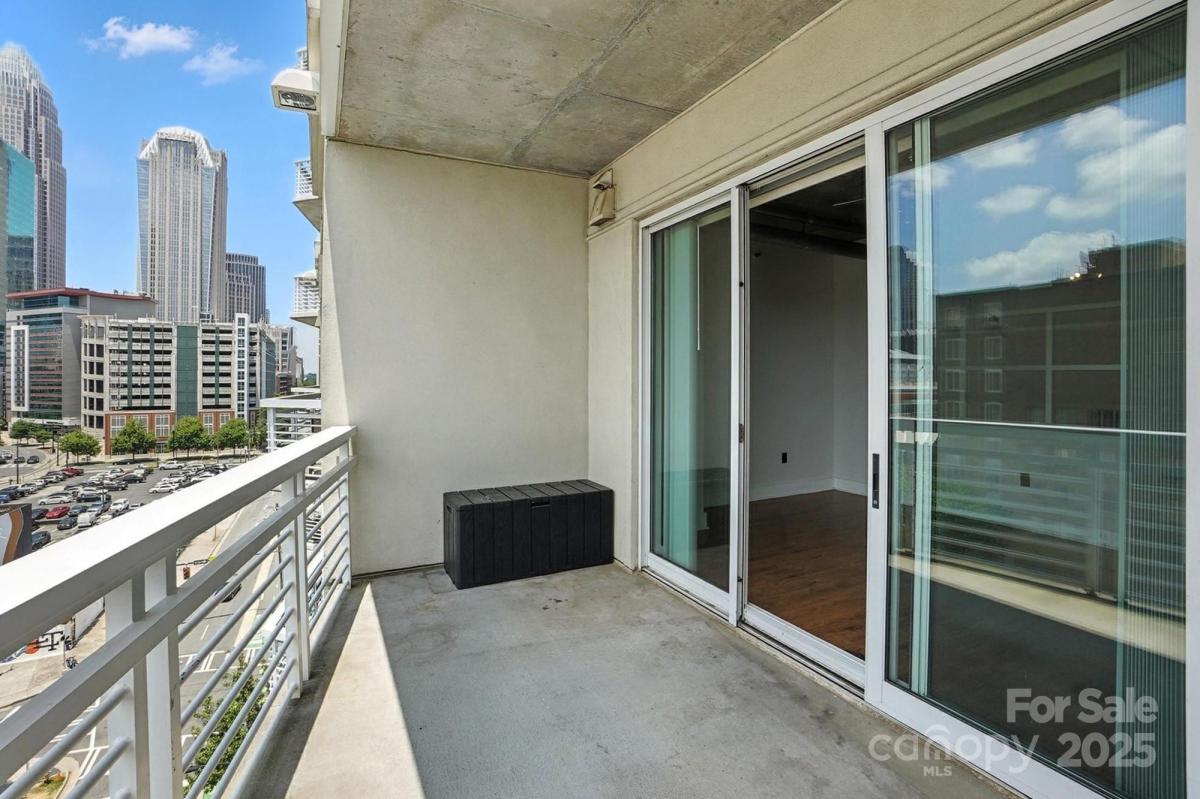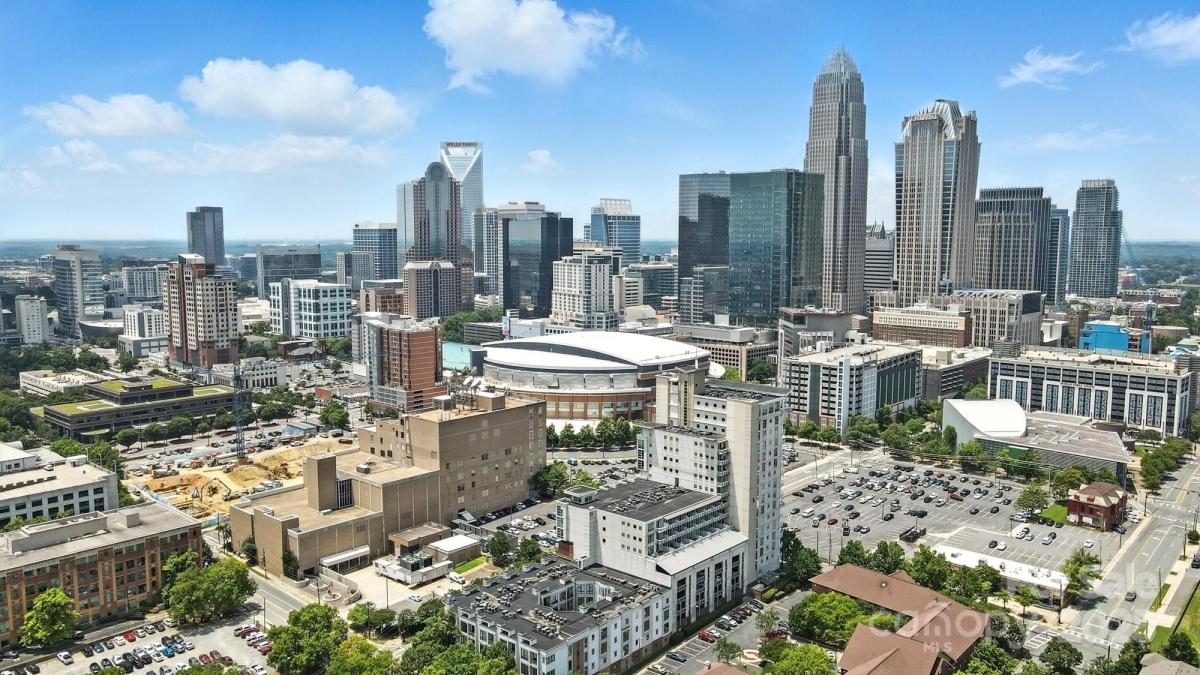 9th floor condo with wonderful skyline views, located in the heart of Uptown Charlotte. This unit is the top floor on this side of the building. Industrial style, open concept home perfect for city entertaining. Kitchen boasts smooth granite counters and large island. Laminate wood flooring throughout, plus large windows. Spacious bedrooms with large closet with custom shelf system and bathrooms. Large balcony overlooks the Arena. Walk to work, dining, entertainment, and Light Rail station. Building offers a rooftop terrace with city views for socializing and relaxing. Enjoy all the Uptown life has to offer! Refrigerator, washer/dryer included. Fresh paint throughout. Two parking spaces in secured deck.